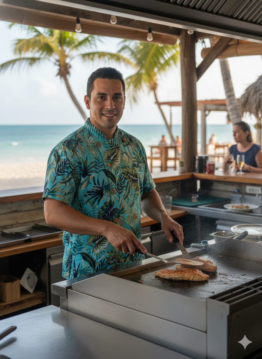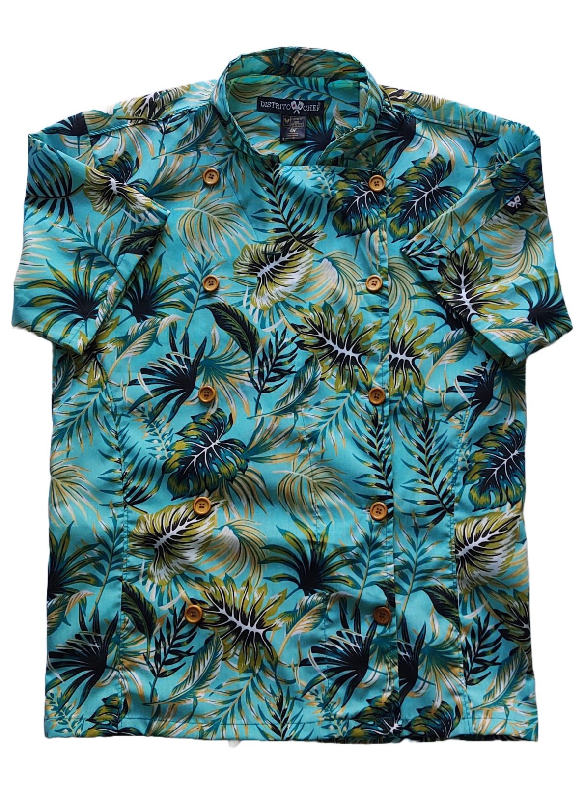 Refresca tu estilo en cocina con esta filipina de inspiración tropical en tonos aqua. Su vibrante combinación de azules, verdes y acentos naturales crea un diseño lleno de vida que transmite frescura, dinamismo y personalidad, perfecto para chefs que buscan destacar con un look moderno y auténtico.
