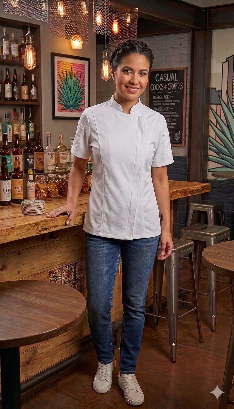 Filipina de cocina Distrito Chef — edición Merengue: diseño color blanco, confeccionada en mezcla de algodón y poliéster resistente y transpirable. Corte cómodo unisex, cierre oculto, bolsillo lateral en mangas, costuras reforzadas; fácil lavado y mantenimiento. Profesional y con estilo para trabajo diario en cocina.