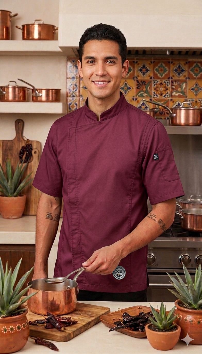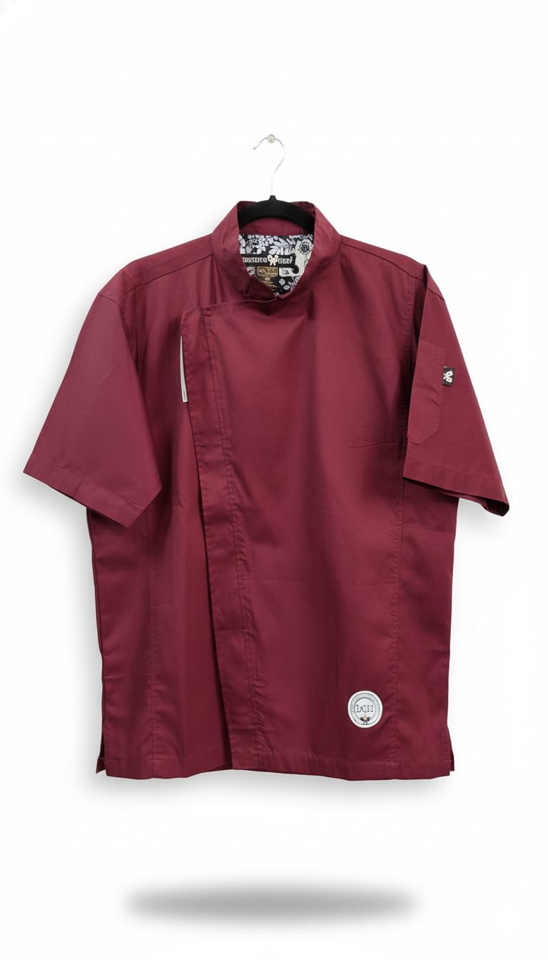 Filipina de cocina Distrito Chef — edición Pimienta Roja: diseño color vino, confeccionada en mezcla de algodón y poliéster resistente y transpirable. Corte cómodo unisex, cierre oculto, bolsillo lateral en mangas, costuras reforzadas; fácil lavado y mantenimiento. Profesional y con estilo para trabajo diario en cocina.