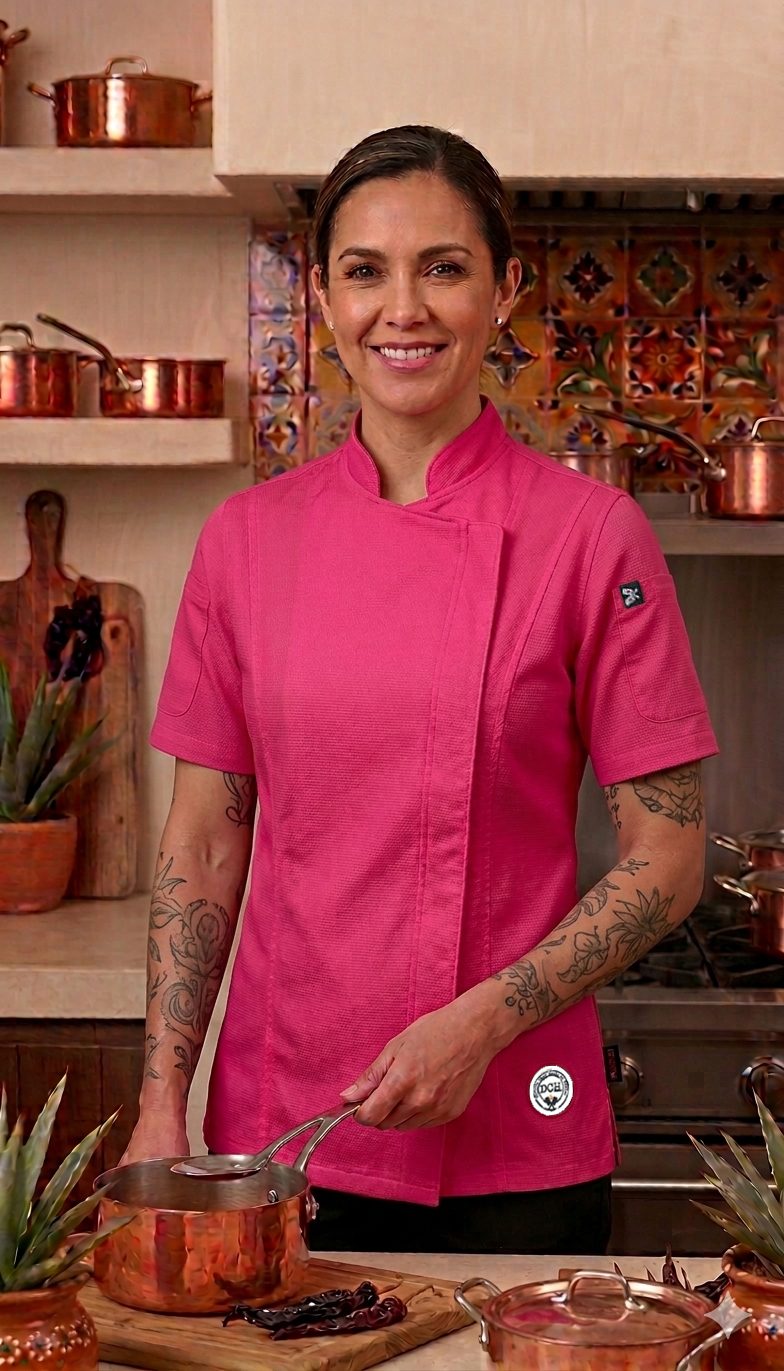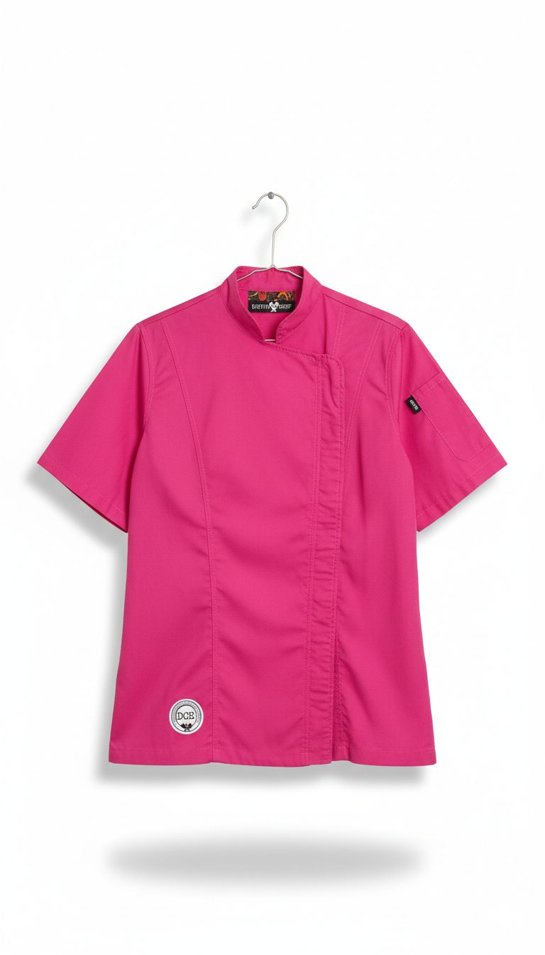Filipina de cocina Distrito Chef — edición Rosa Mexicano: diseño color rosa, confeccionada en mezcla de algodón y poliéster resistente y transpirable. Corte cómodo unisex, cierre oculto, bolsillo lateral en mangas, costuras reforzadas; fácil lavado y mantenimiento. Profesional y con estilo para trabajo diario en cocina.
