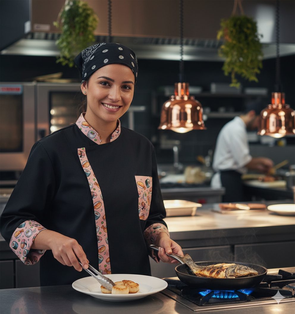 Filipina con diseño ideal para poner y quitar fácilmente. Corte fit, modelo con cierre industrial, cubre cierre, cuello y manga estampado, tela transpirable en laterales para mayor comodidad y te mantengas siempre freso en cocina, manga 3/4 para evitar quemaduras y que tu filipina luzca increible.