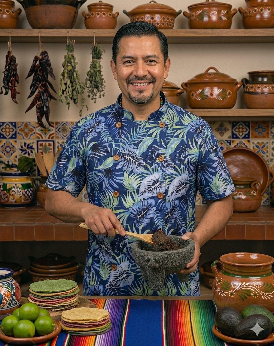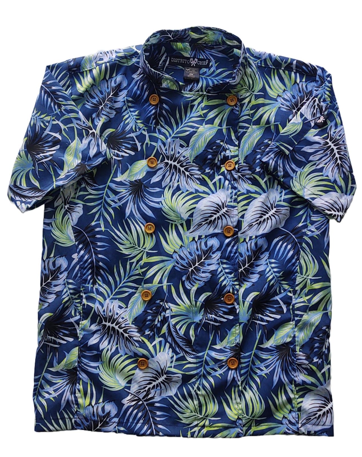 Lleva tu estilo al siguiente nivel con esta filipina de cocina de inspiración tropical en tonos azules. Su estampado de hojas y flores en contrastes frescos y profundos transmite elegancia, energía y personalidad, ideal para chefs que buscan destacar con un look moderno y auténtico.